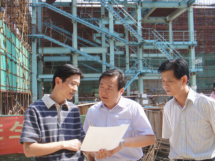 9月16日,安吉县县长单锦炎,副县长任烽、黄培林等,到建设工地现场检查指导工作。图为旺能安吉项目常务副总指挥房华向单县长、黄副县长汇报工程情况。